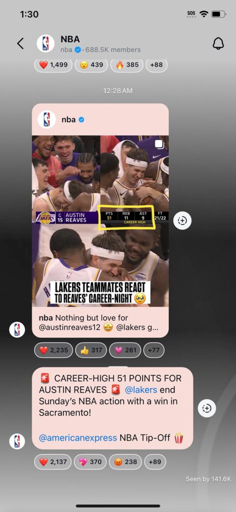 NBA: Instagram Yayın Kanalları’nda (Broadcast Channels) takipçilerine özel içerikler sunarak, markaya olan bağlılığı ve sadakati derinleştiriyor. Tüketicilerin %82’si özel veya kamera arkası içerikleri paylaşan markalarla daha bağlı hissettiğini belirtirken, bu kanallardaki kullanıcıların %75’i kendileriyle doğrudan etkileşim kuran markalara daha yakın hissediyor. NBA bu trendi, hayranlarına doğrudan ulaşarak kullanıyor.